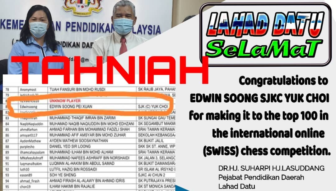 Congratulations to Edwin Soong (6K) for making it to the top 100 in the international online (SWISS) chess competition.